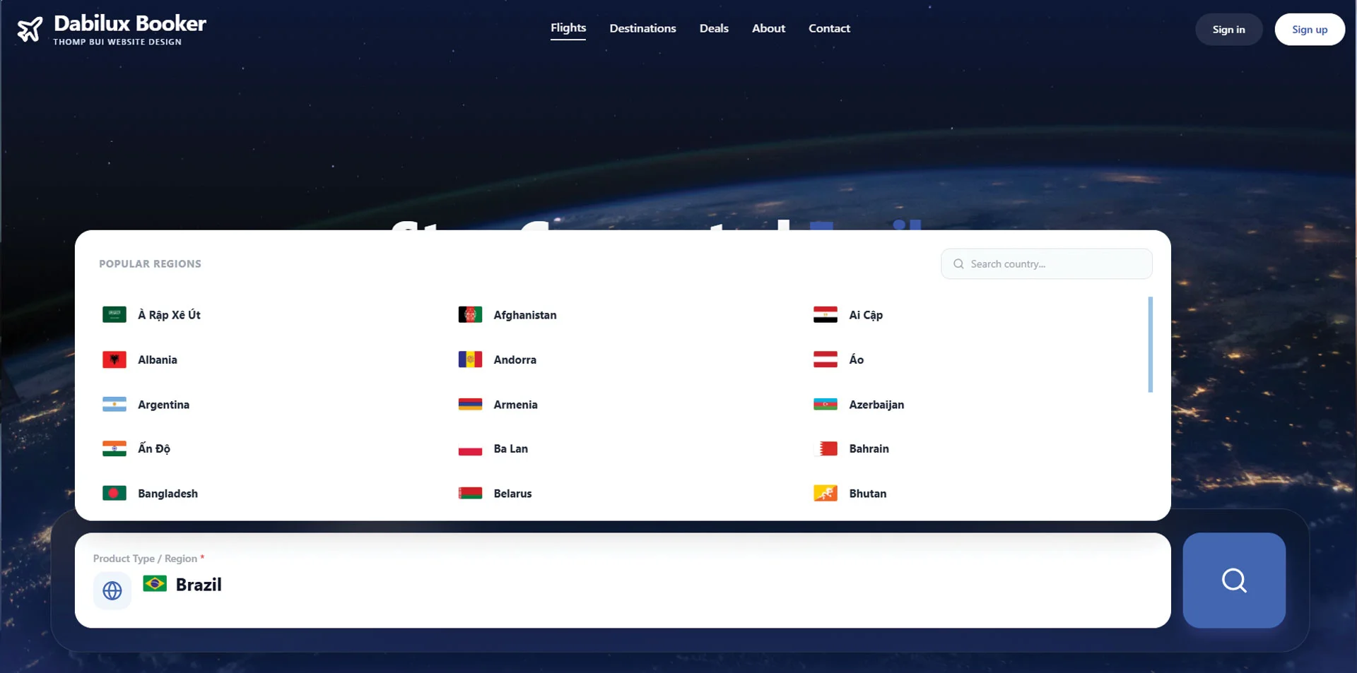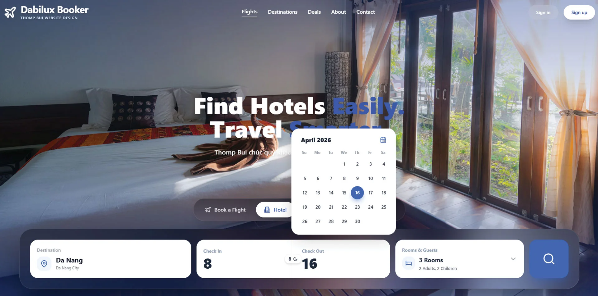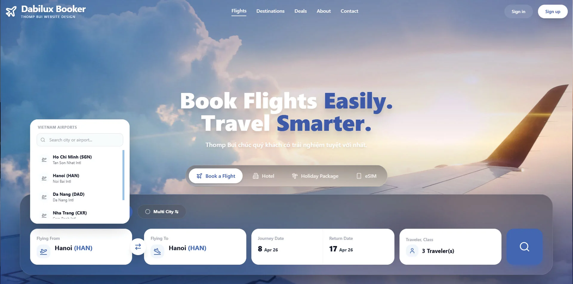 Thấu hiểu sâu sắc tâm lý đó, nhà thiết kế Thomp Bui đã cho ra đời Dabilux Booker – một tuyệt tác giao diện Hero Section (khu vực màn hình chính) dành riêng cho ngành du lịch. Không ngoa khi nói rằng, đây là một chuẩn mực mới về UI/UX (Giao diện và Trải nghiệm người dùng), phá vỡ mọi khuôn mẫu thiết kế truyền thống để mang lại một quy trình đặt vé máy bay, khách sạn, tour du lịch và eSIM "mướt mượt", xịn xò và đậm chất nghệ thuật.