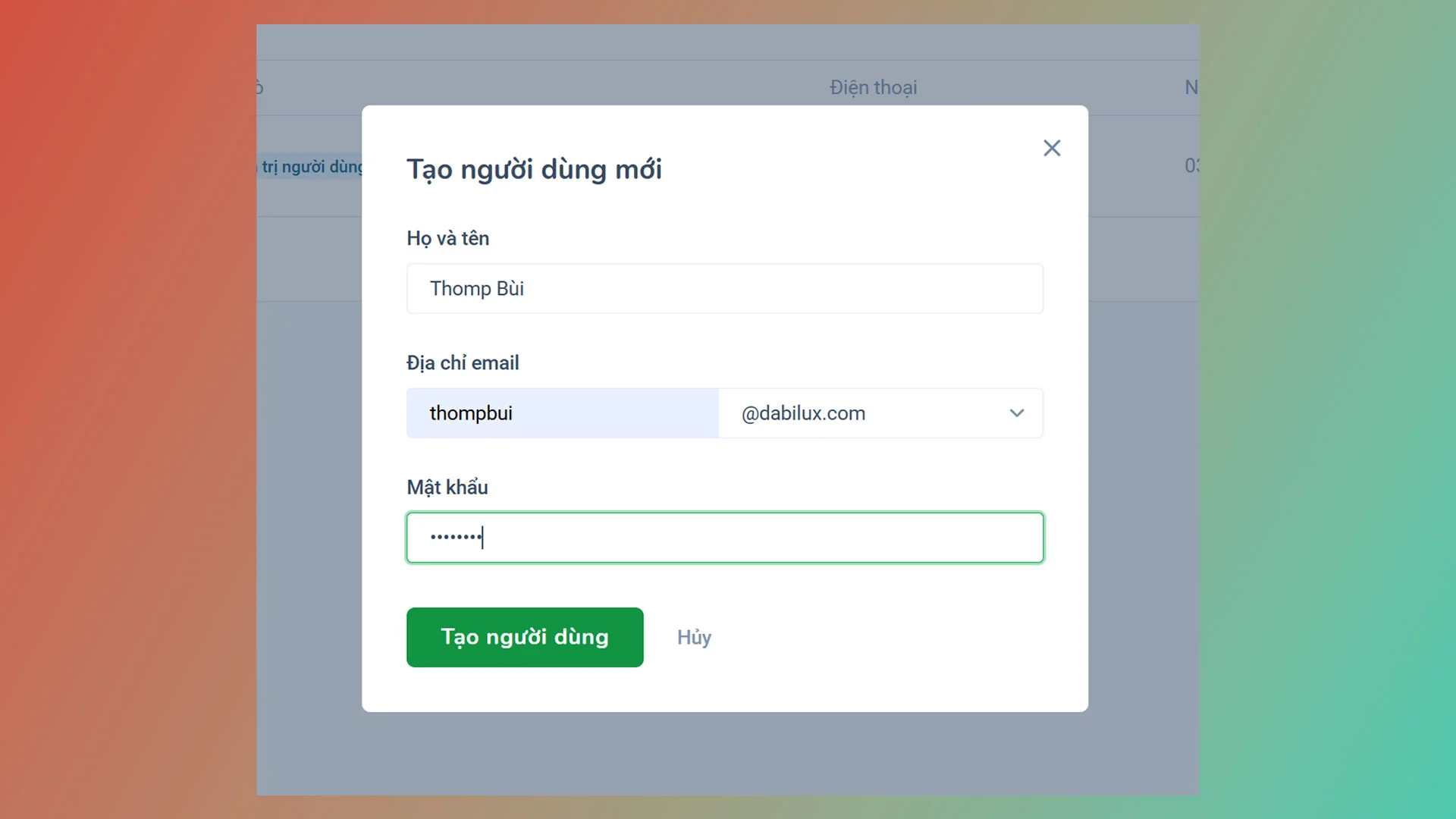 Chúng ta sẽ vào người dùng -> ấn vào nút tạo người dùng mới ở bên phải và điền thông tin email của chúng ta vào để tạo người dùng